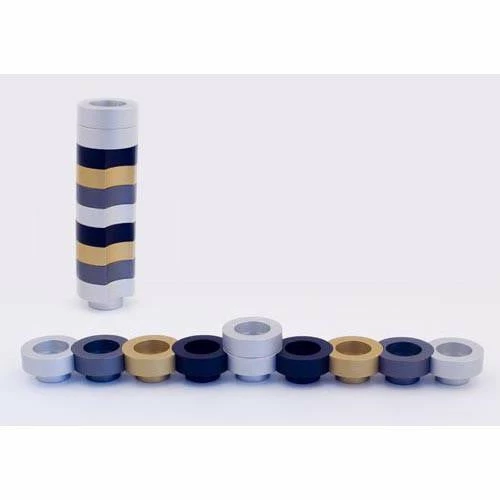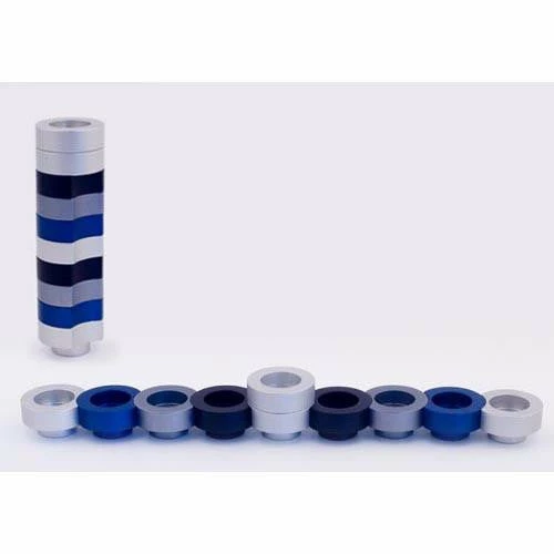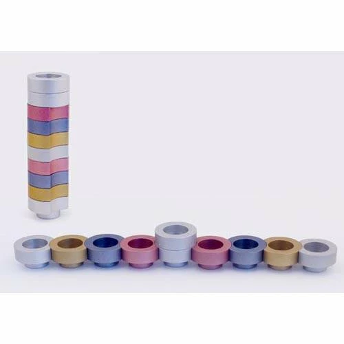 THE DOUGHNUT TRAVELING MENORAH. Stacking candle holders in lightweight anodized aluminum fold into a smooth column for travel; and unfold into a charming string of doughnut shaped pieces that form a unique and stylish Hanukah Menorah or can be used for traveling candle sticks. Smooth texture, sophisticated coloring, practical and useful. Comes in a velvet pouch.