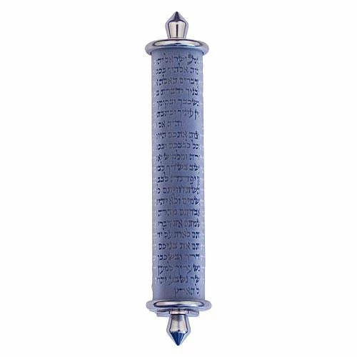 Shaped as a Bet Megillah, a Megillah cover, this Mezuzah, made of glass, highlights the exceptional features of the scroll seen through it, and brings out to light its content, for all to see. A combination of glass, ink and scroll shaped cover that will not fail to surprise you and your guests.