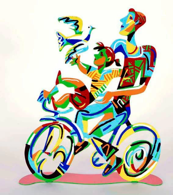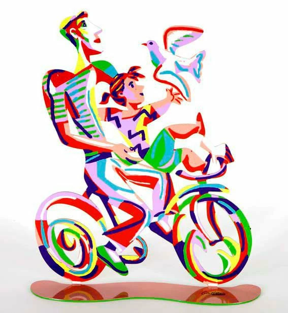 Israeli artist David Gerstein’s “Riders” sculptures are created through the unique process of serigraphy on laser cut steel. The result is a special piece of art that is colorful, whimsical and contemporary. Each piece is double sided for maximum beauty from all angles.