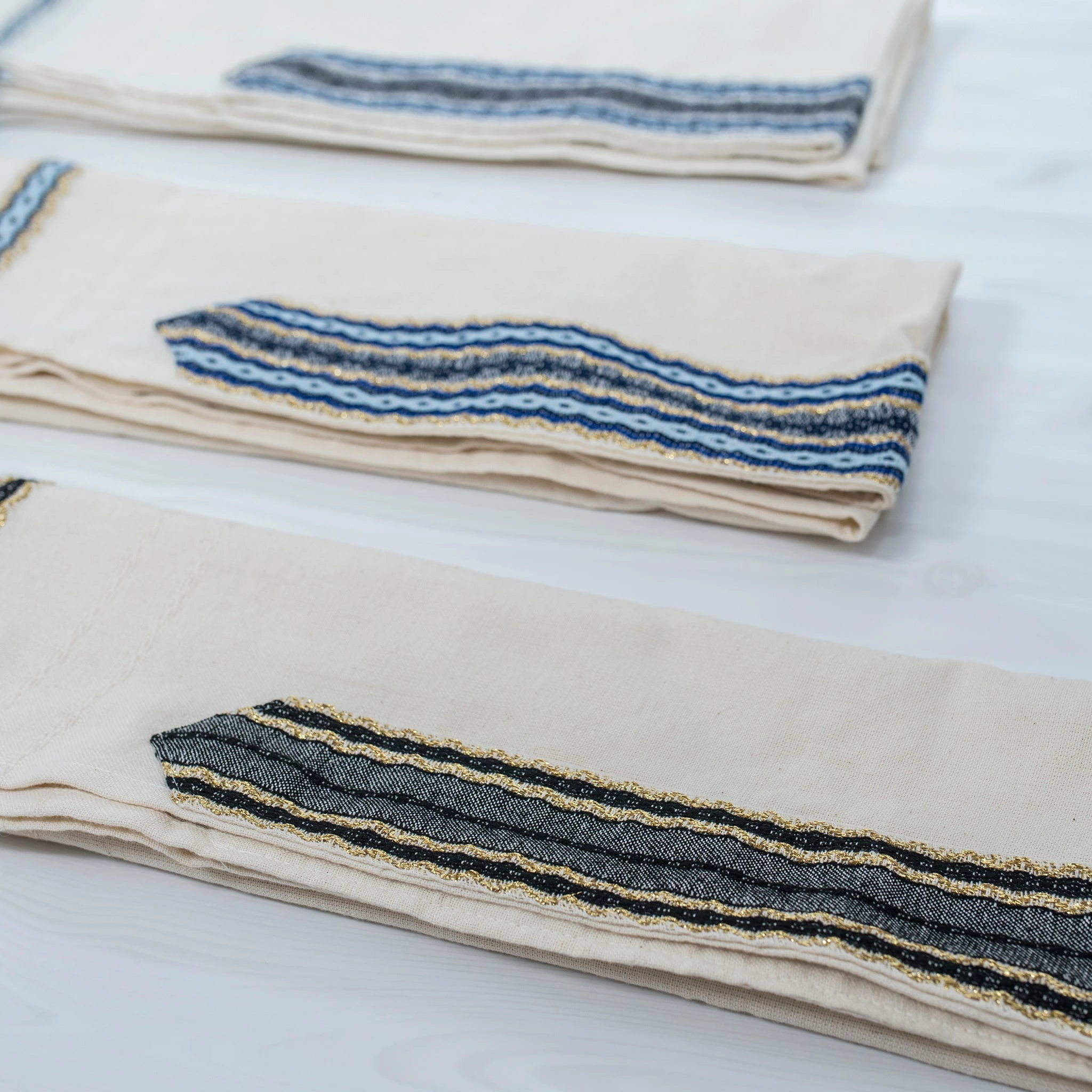 While ordering, choose to further customize your tallit by adding an atara, collar, with a hand embroidered blessing for donning the tallit and/or tzizit that include Ptil Tekhelet, blue strands.