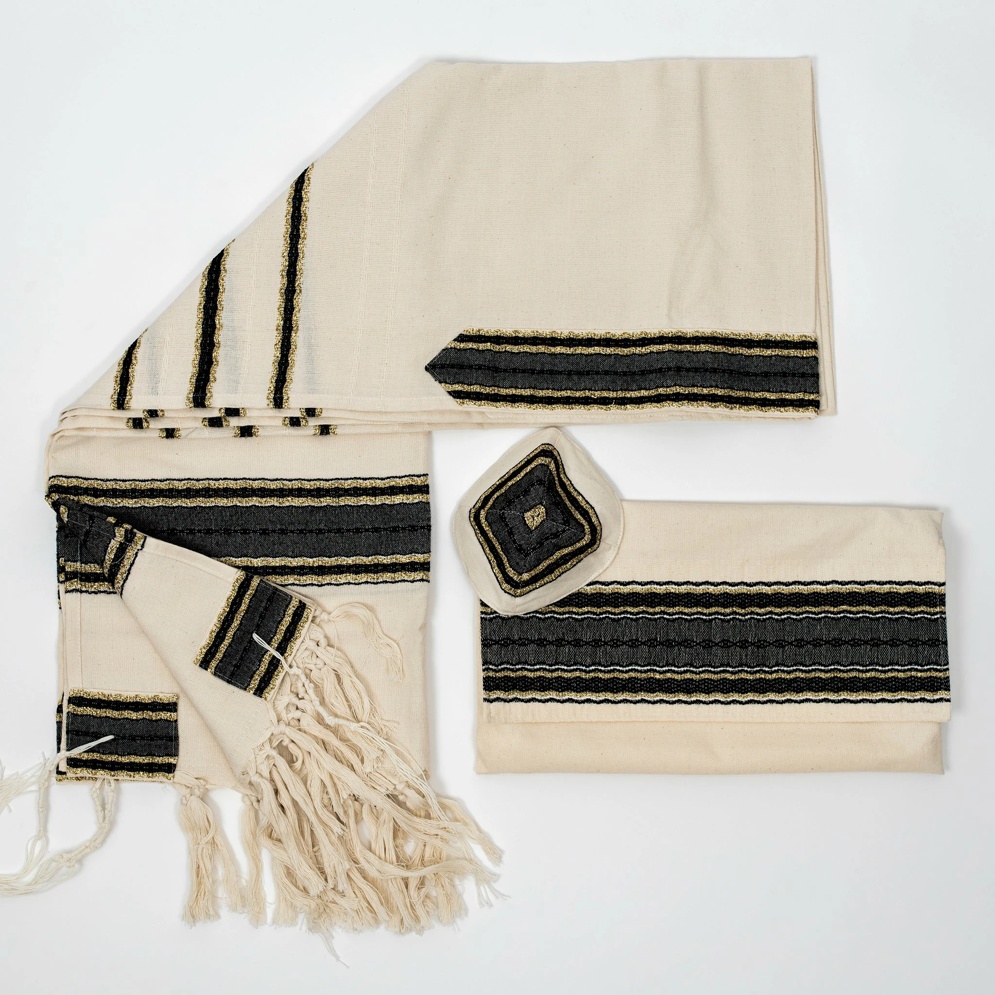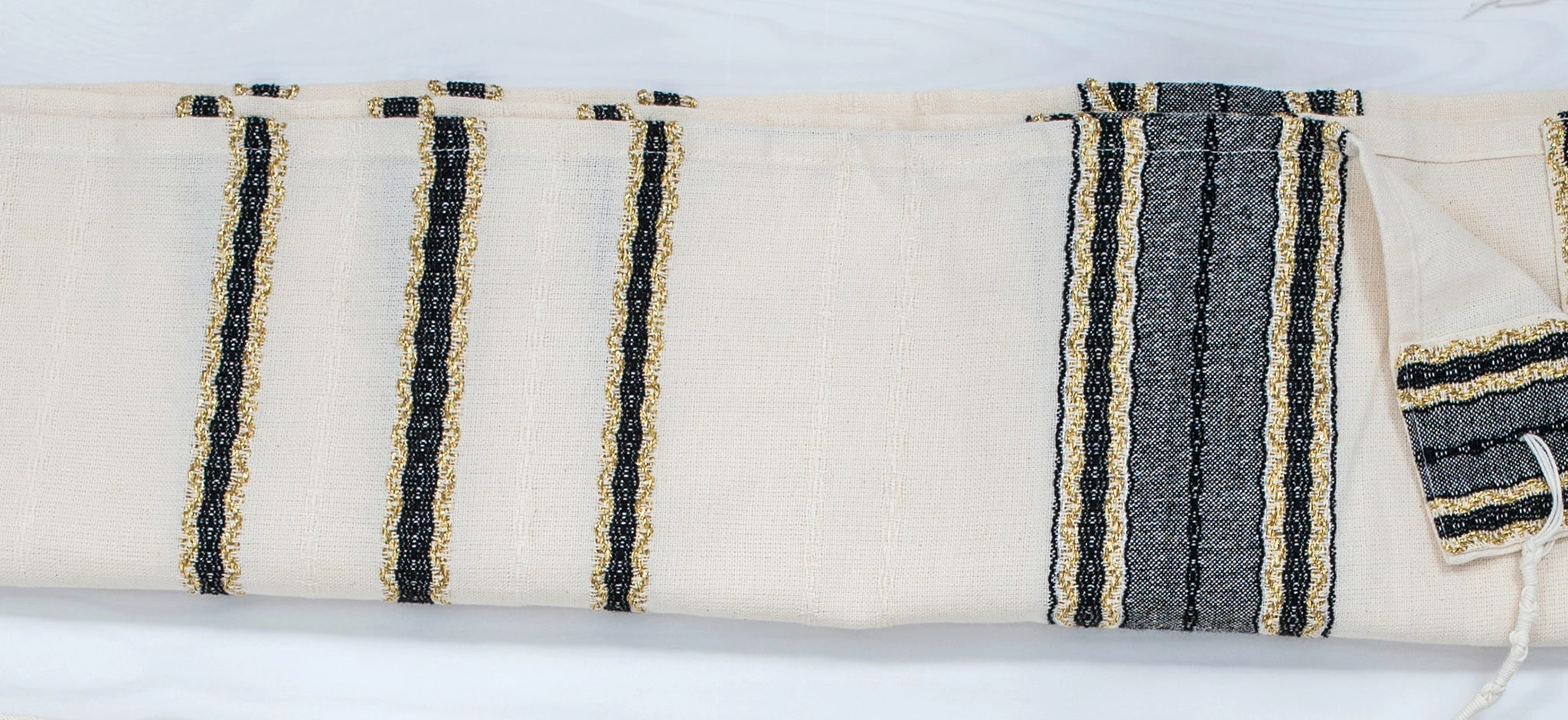 Gabrieli tallits are hand woven in our studio in Israel by our experienced tapestry artisans. We use the finest materials to ensure a finished product of the highest standard. All Gabrieli tallits are sold as a set that includes a matching kippah and tallit bag along with the tallit itself.
