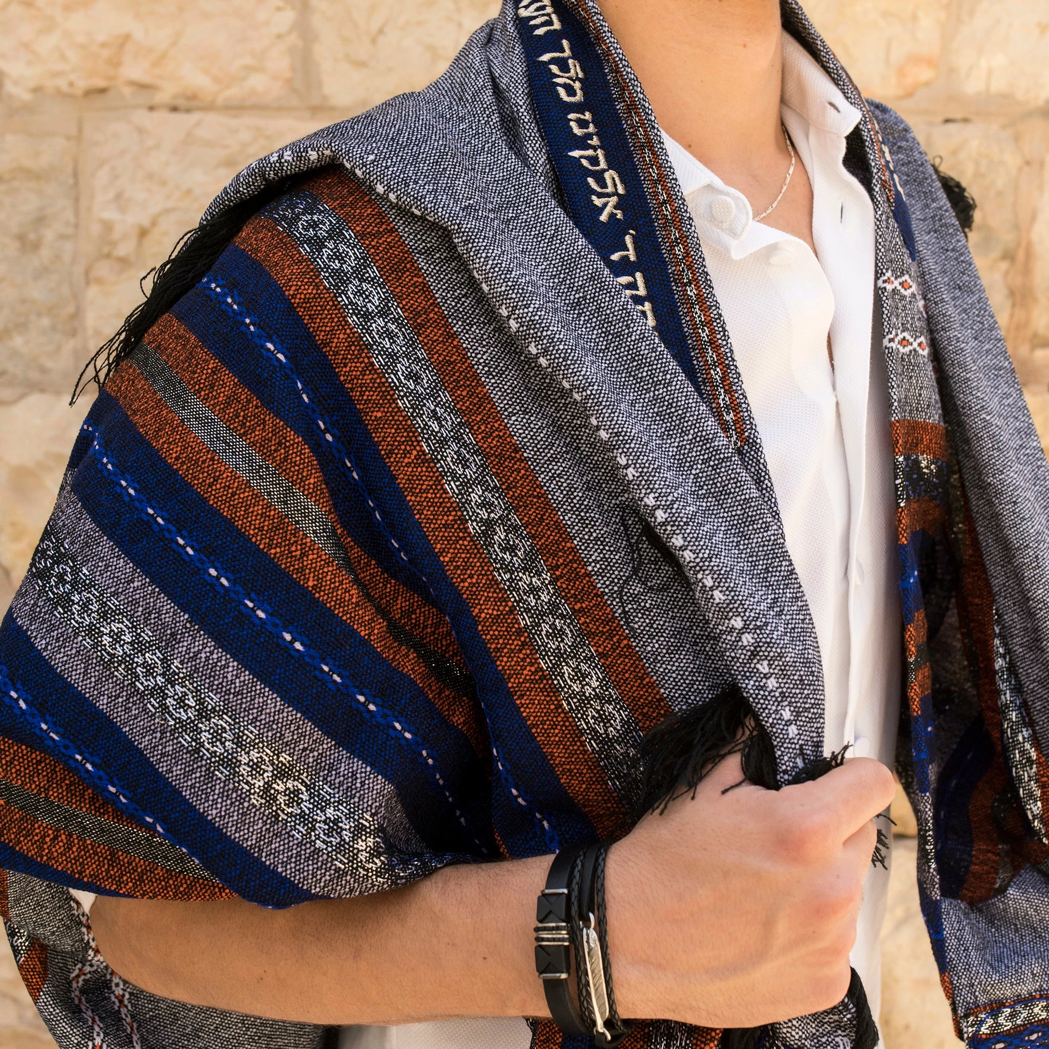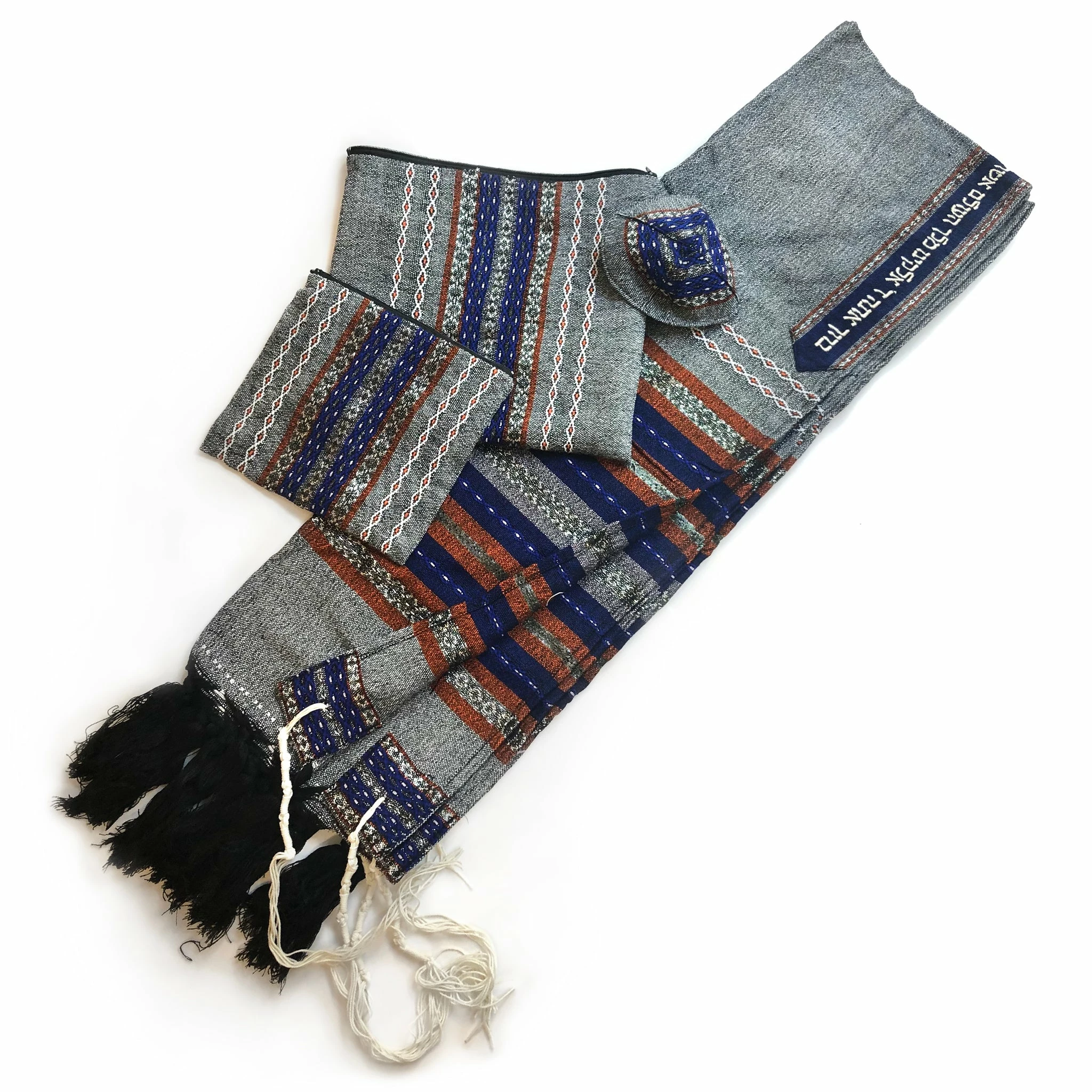 Hand woven in our studio in Israel by our experienced tapestry artisans, our Premium Collection consists of tallits with more intricate designs and patterns making each tallit a premium work of art. Each premium tallit comes standard with a hand embroidered blessing on the collar, double sided patterned corners, thick tzizit and a matching tefillin bag. As with all of our Gabrieli sets, the premium collection also includes a matching kippah and tallit bag.