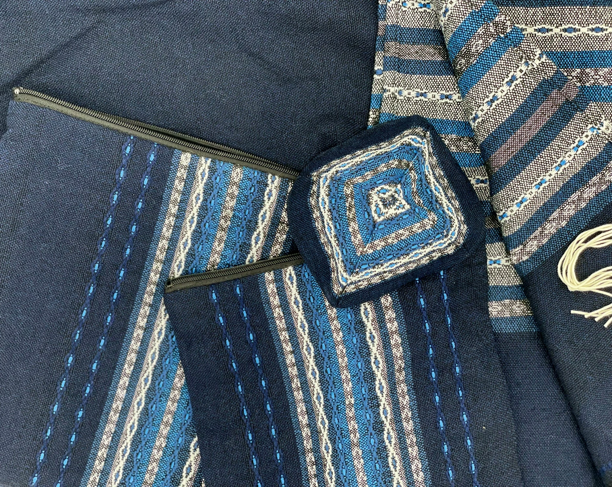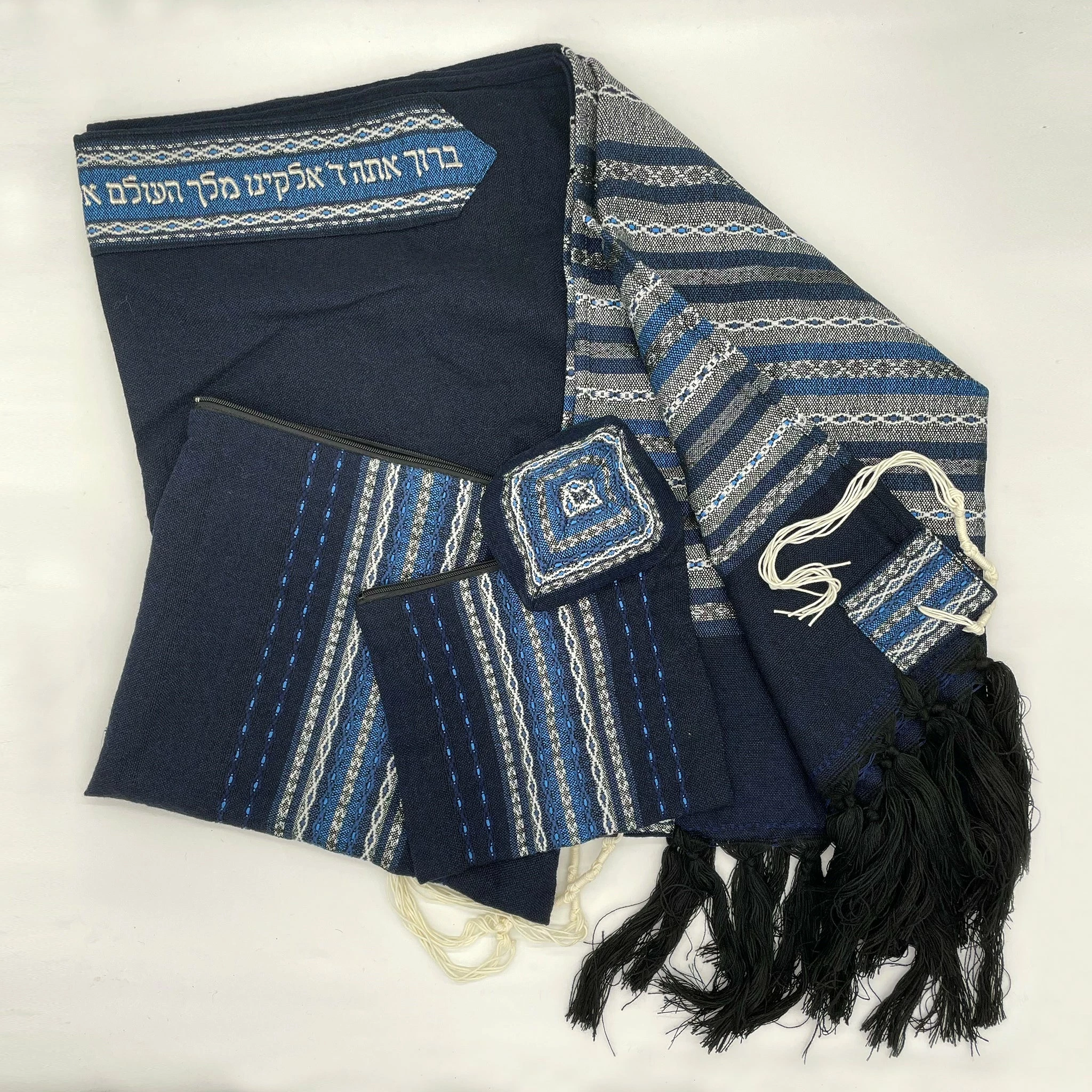 Hand woven in our studio in Israel by our experienced tapestry artisans, our Premium Collection consists of tallits with more intricate designs and patterns making each tallit a premium work of art. Each premium tallit comes standard with a hand embroidered blessing on the collar, double sided patterned corners, thick tzizit and a matching tefillin bag. As with all of our Gabrieli sets, the premium collection also includes a matching kippah and tallit bag.
