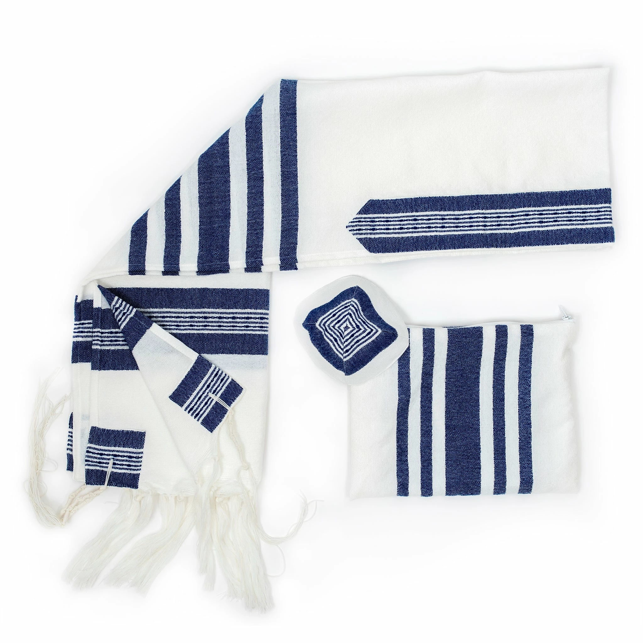 Gabrieli tallits are hand woven in our studio in Israel by our experienced tapestry artisans. We use the finest materials to ensure a finished product of the highest standard. All Gabrieli tallits are sold as a set that includes a matching kippah and tallit bag along with the tallit itself.