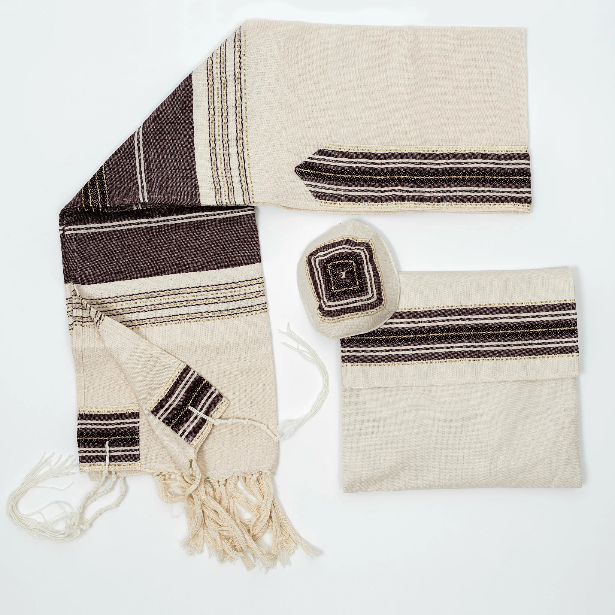 Gabrieli tallits are hand woven in our studio in Israel by our experienced tapestry artisans. We use the finest materials to ensure a finished product of the highest standard. All Gabrieli tallits are sold as a set that includes a matching kippah and tallit bag along with the tallit itself.