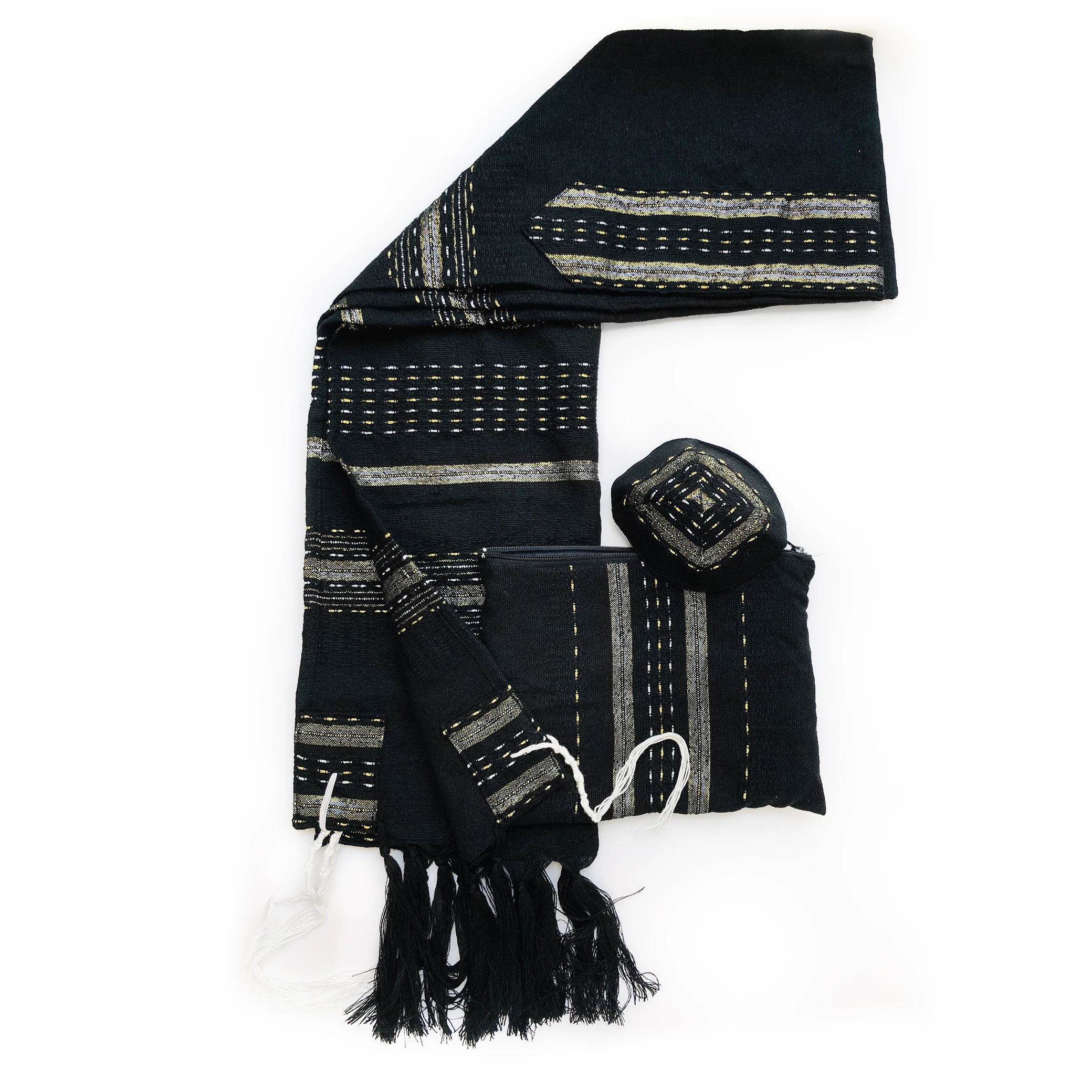 Gabrieli tallits are hand woven in our studio in Israel by our experienced tapestry artisans. We use the finest materials to ensure a finished product of the highest standard. All Gabrieli tallits are sold as a set that includes a matching kippah and tallit bag along with the tallit itself.