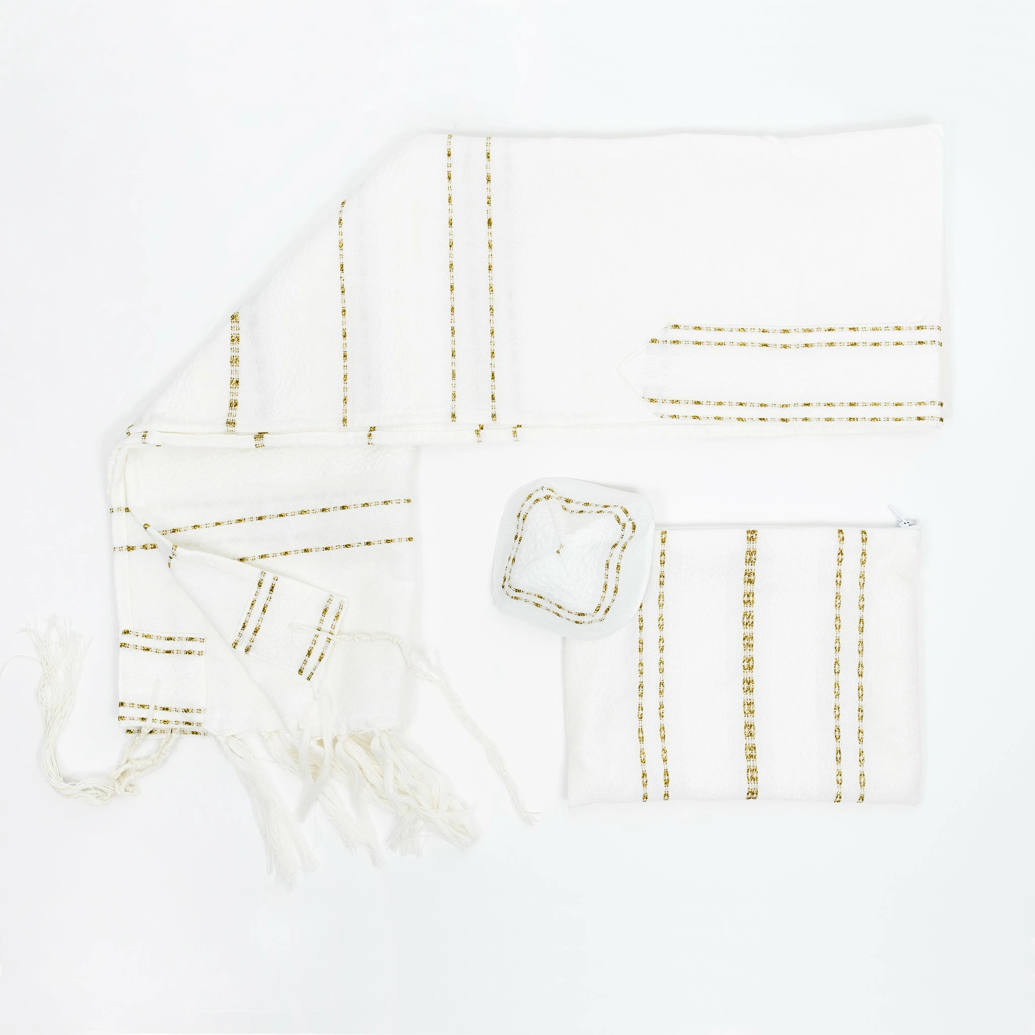 Gabrieli tallits are hand woven in our studio in Israel by our experienced tapestry artisans. We use the finest materials to ensure a finished product of the highest standard. All Gabrieli tallits are sold as a set that includes a matching kippah and tallit bag along with the tallit itself.