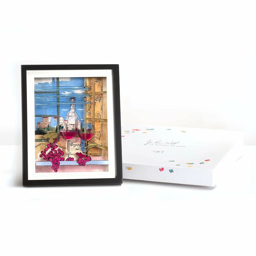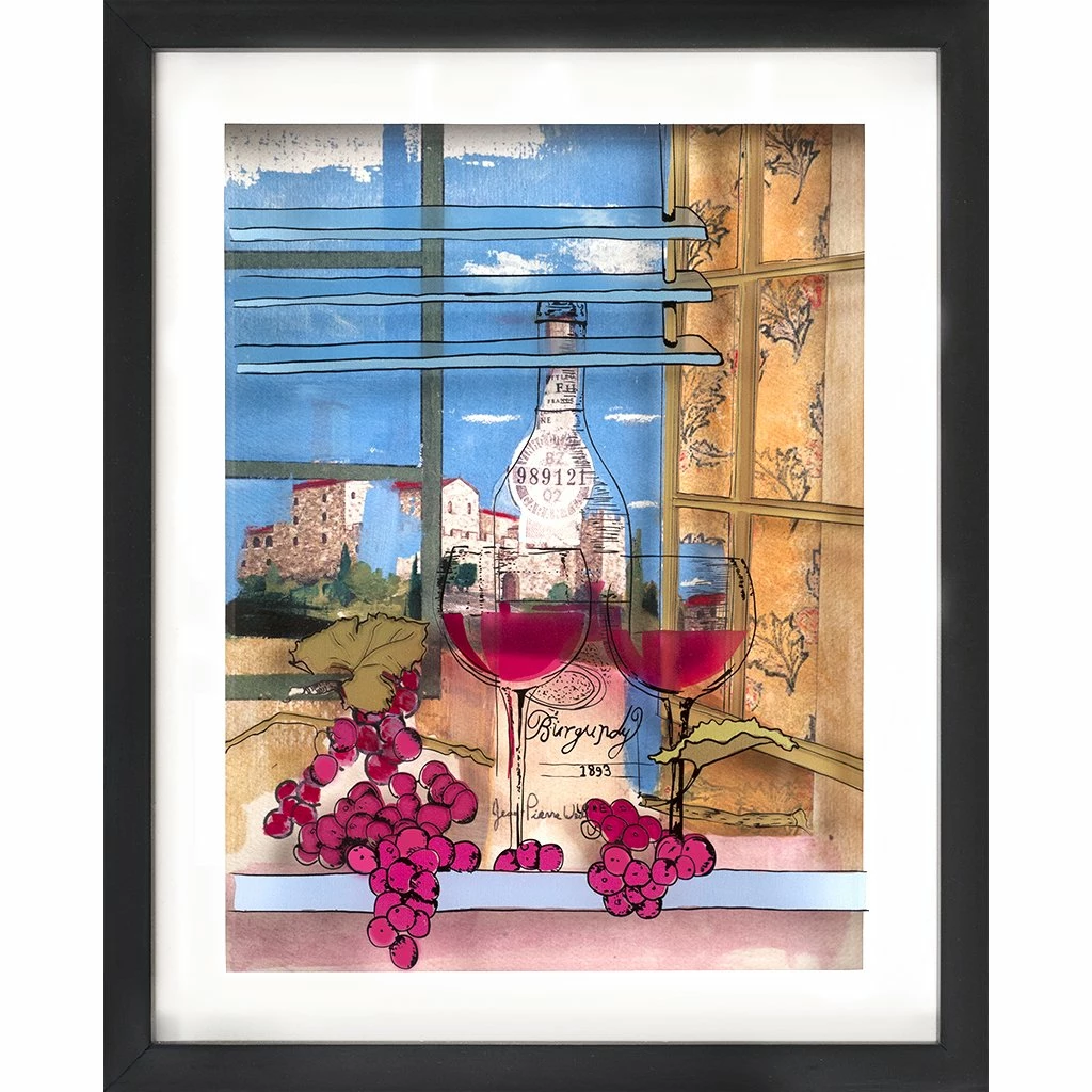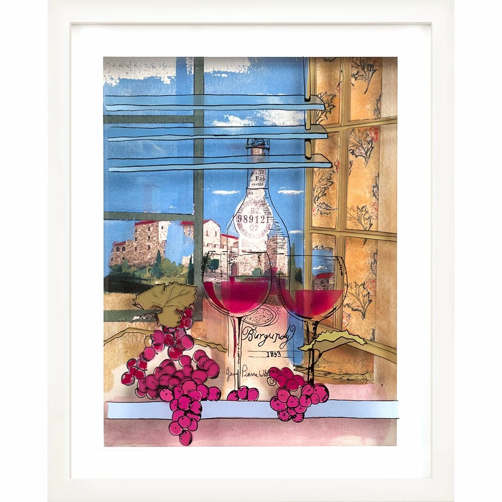 Two glasses of wine stand ready for the toast of some joyous occasion. Dark red grapes and blue skies through the window suggest a rich summer moment. L’chaim! To life!