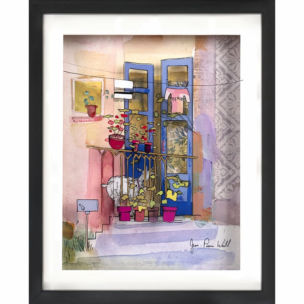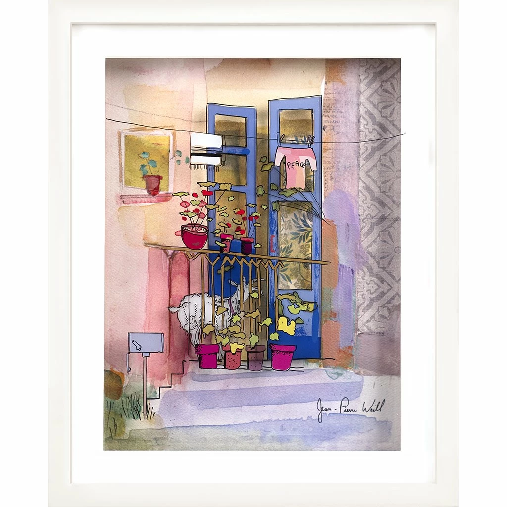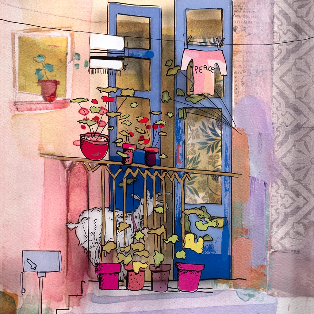It is a quiet morning, filled with light and the scent of flowers. A goat has wandered up a few steps onto the balcony, curious about the fresh laundry hanging out to dry. A sense of calm permeates this peaceful scene.